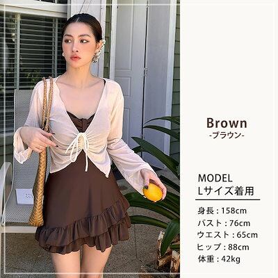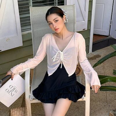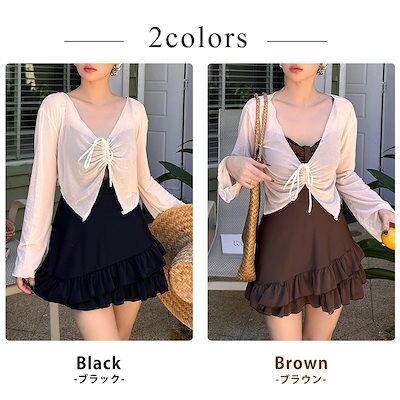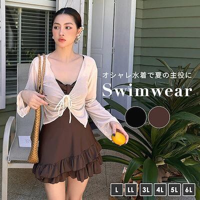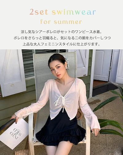 水着 ワンピース 体型カバー シースルー トップス 2点セット レディース オールインワン 大きいサイズ キャミワンピ クロップド丈 ボレロ 長袖 胸元 ギャザー ティアード フリル ノンワイヤー 二