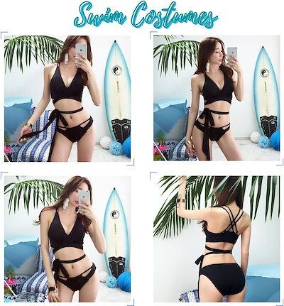 レディース ビキニ 水着 2点セット ストラップ セクシー スイムドレス レースアップ セパレート 編みあげ ブラック水着 三角水着 上下セット ビキニセット 女性水着 ハイウエストショーツ 無地