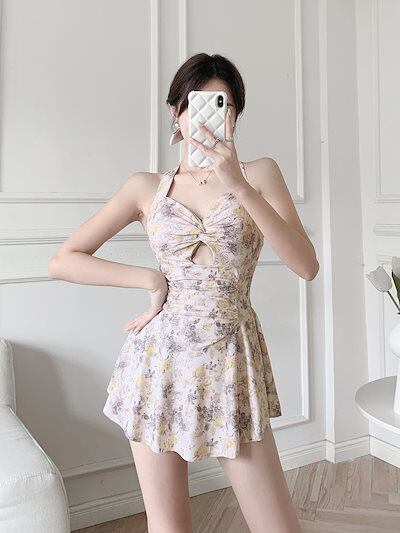 2024 水着レディース夏ハイエンド花柄ワンピーススカート純粋な欲望スタイル貧乳ホルターネック水着