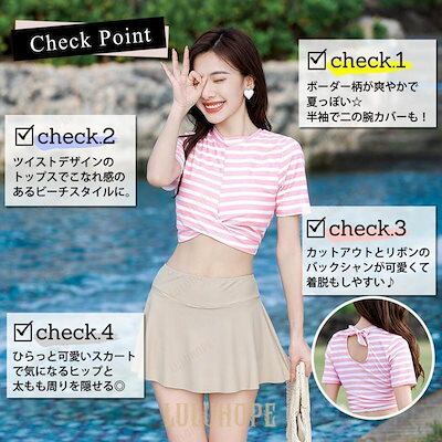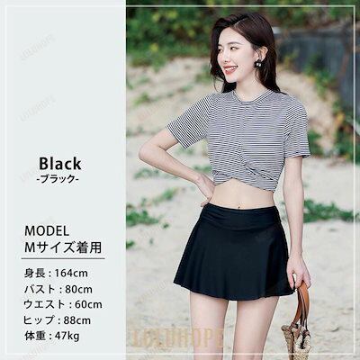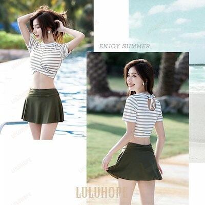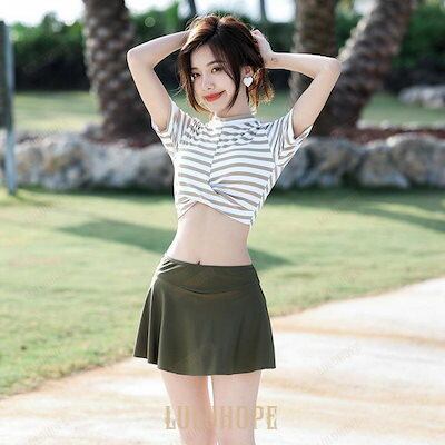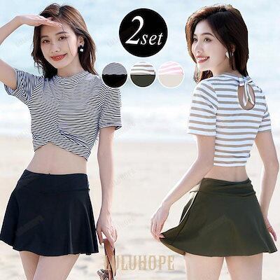 新品(タイムセール)水着 レディース トップス スカート 2点セット 体型カバー 半袖 セパレート 可愛い 大人 洋服みたい ボーダー
