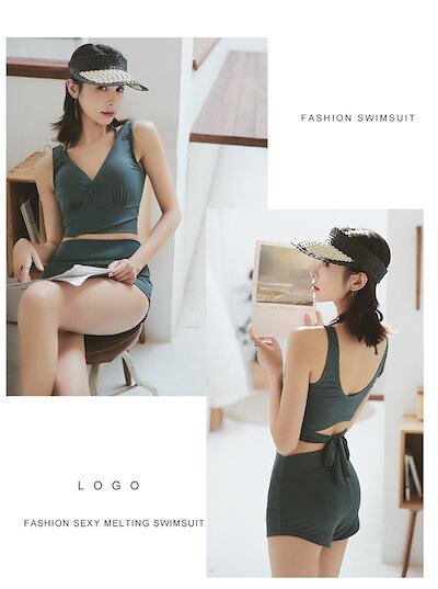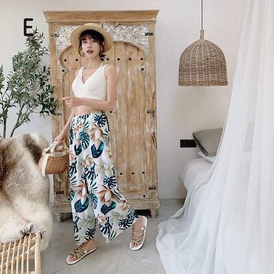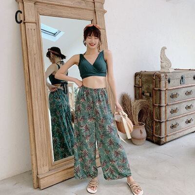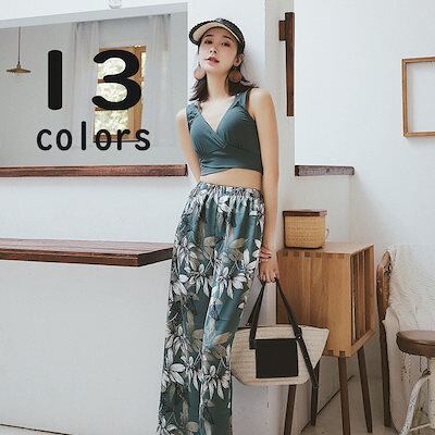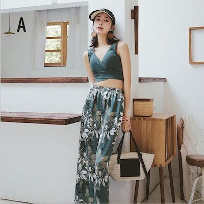 水着 レディース 体型カバー 水着 タンキニ Vネック ビキニ ワイドパンツ 3点セット 20代 30代 40代 ママ水着 ロングパンツ バックシャン カシュクール風 可愛い お洒落 くすみカラー ボ