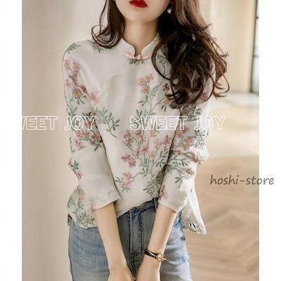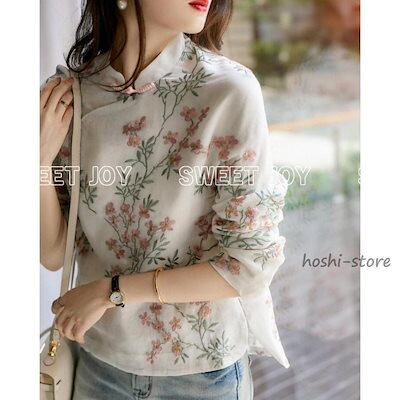 新作ブラウス チャイナ風 レディース 長袖 リネンブラウス 綿麻混 花柄 刺繍 シャツ スタンドカラー プルオーバー チャイナボタン ゆったり ナチュラル 春 夏 秋