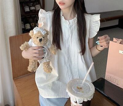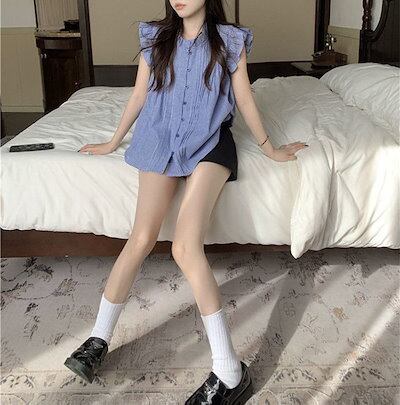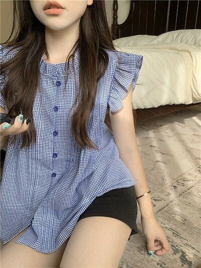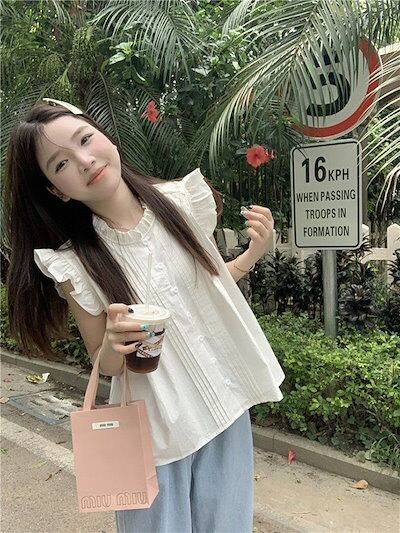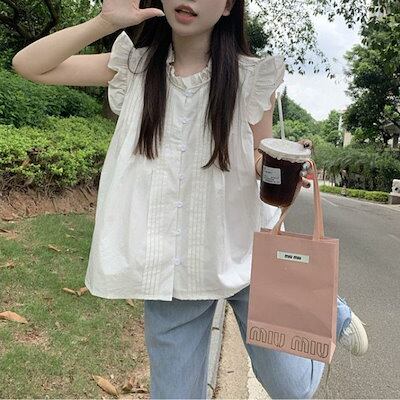 ブラウス 肩フリル レディース ノースリーブ シャツブラウス トップス 白シャツ 袖なし シャツ 前開き インナー ボタン タンクトップ お洒落 可愛い カジュアル 無地 チェック柄 シンプル ゆった