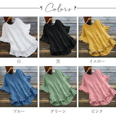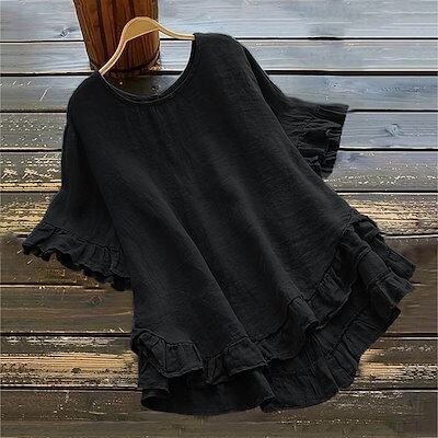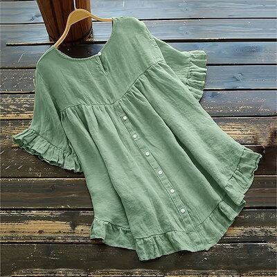 チュニック シャツ 半袖 ブラウス 綿麻 レディース 無地 クルーネック フレア Tシャツ トップス 裾フレア バックボタン 着痩せ ゆったり 体型カバー おしゃれ 可愛い シンプル カジュアル ナチ