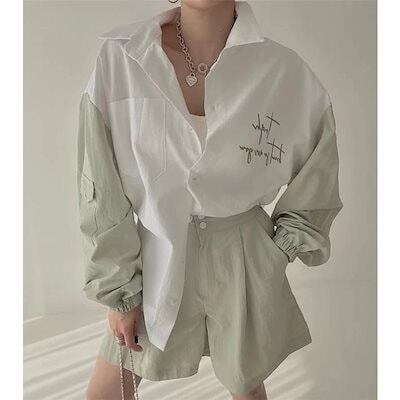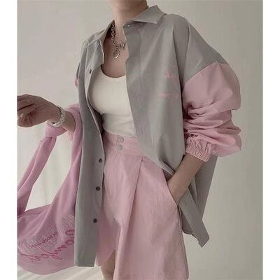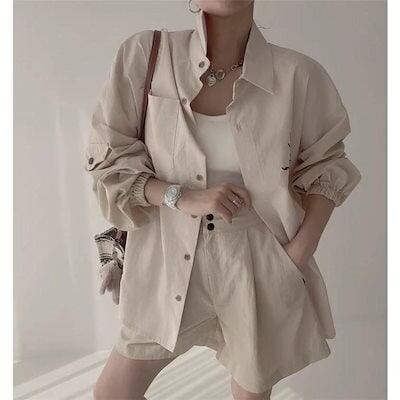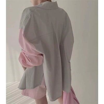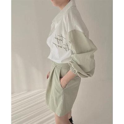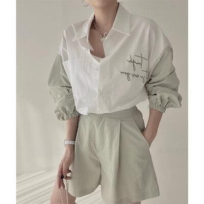 ゆったりシャツ トップス ナチュラルな風合い 前開き 折り襟 切り替え ボタン留め ボリューム袖デザイン 長袖 レディース 春新作 大きいサイズ
