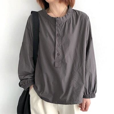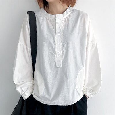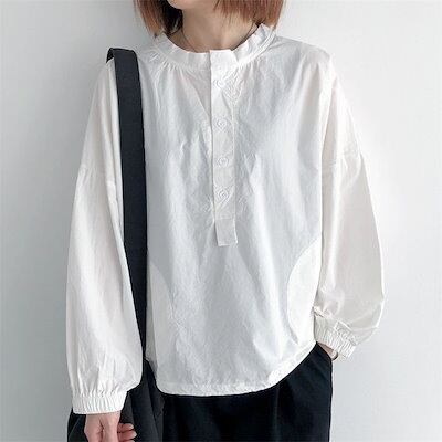 バンドカラー シャツ ブラウス 長袖 無地 裾ドロスト ハーフボタン 秋 春 冬 シャツブラウス レディース ブラウス プルオーバー トップス 白シャツ 長袖シャツ 大きいサイズ 上品 きれいめ フォ