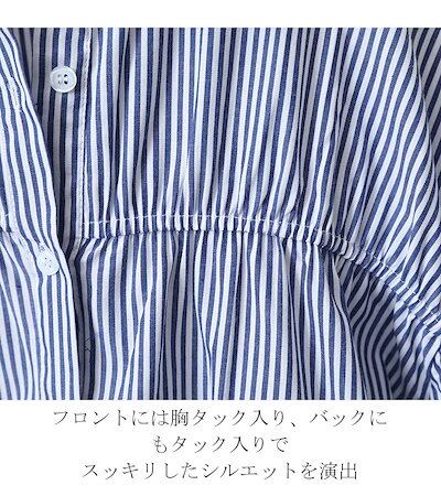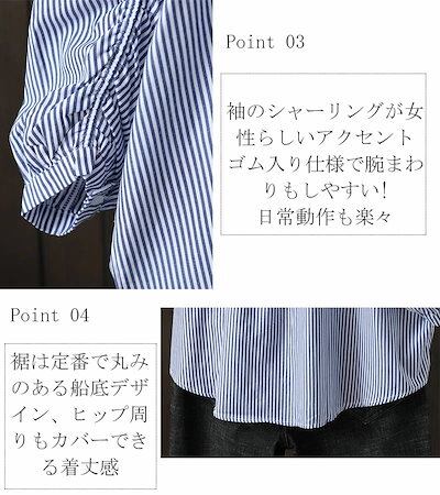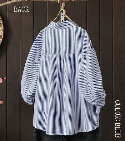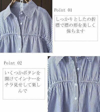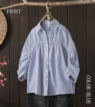 シャツ ブラウス レディース 春夏 シャツブラウス ストライプシャツ 七分袖 折襟 ワイシャツ ドルマン 袖ギャザートップス ボタン留め アシンメトリー コットン 綿 フレア シャーリ