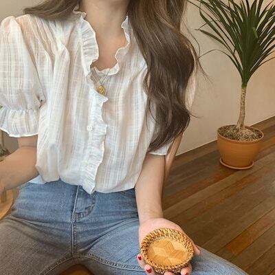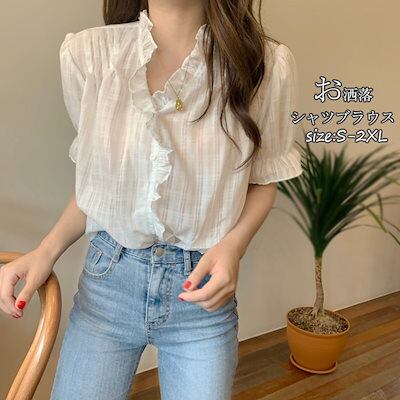 シャツ 半袖 大きいサイズ レディース 白シャツ 羽織り シャツブラウス フリル襟 バルーン袖 パフスリーブ ボリューム袖 チェック柄 フリル 袖 トップス ホワイト ボタン 前開き 羽織 羽織もの