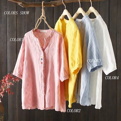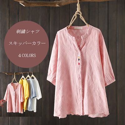 シャツ 綿シャツ ブラウス 無地 刺繍 半袖 ボタン留め 夏 レディース トップス 通勤 タック コットン 薄手 スキッパーカラー 20代 30代 オシャレ きれいめ ゆったり カジュアル