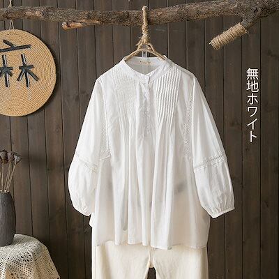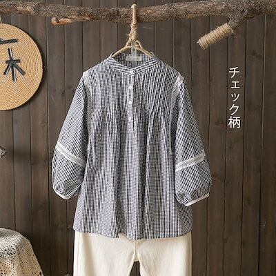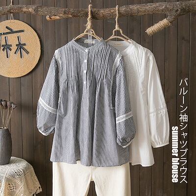 7分袖 シャツ レディース ワイシャツ バルーン袖 トップス バンドカラー シャツブラウス 七分袖 ボリューム袖 ボタン ブラウス ギャザー ピンタック プルオーバー チェック柄 無地 綿 コットン