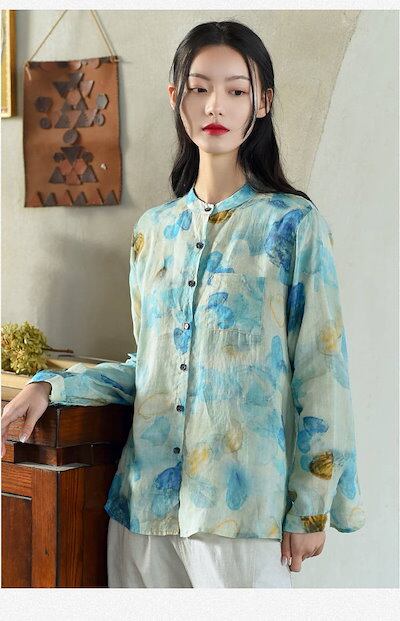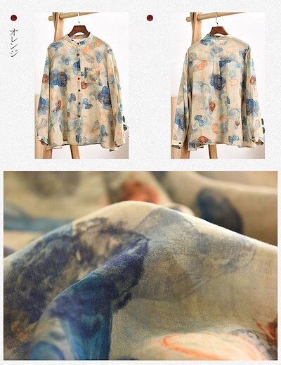 リネンシャツ 春夏 前開き ボタン留め シャツブラウス 総柄 フレア 立ち襟 トップス レディース 長袖 ゆったり カジュアル おしゃれ バックタック