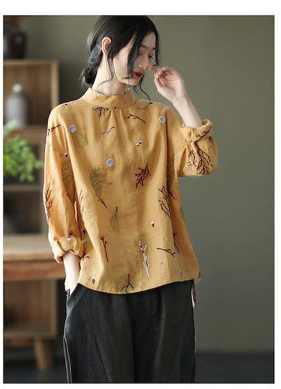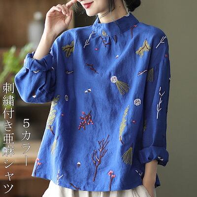 長袖シャツ リネンシャツ 綿麻シャツ シャツブラウス 刺繍 レディース トップス リバーシブル 通気性 バック開き ボタン留め 春秋 カジュアル 30代 40代