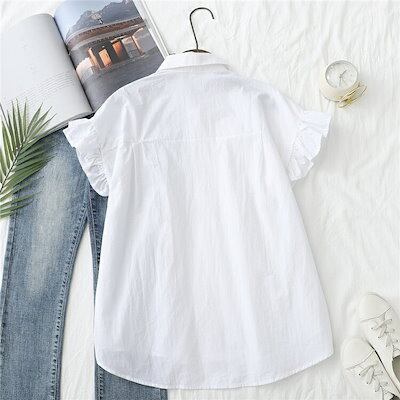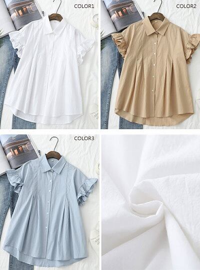 シャツ ブラウス 半袖 レディース シャツブラウス 白シャツ 折り襟 綿シャツ 綿 半袖シャツ フレンチスリーブ フリル フレア 前後差 アシンメトリー 不規則裾 ボタン止め 夏シャツ トップス 大き