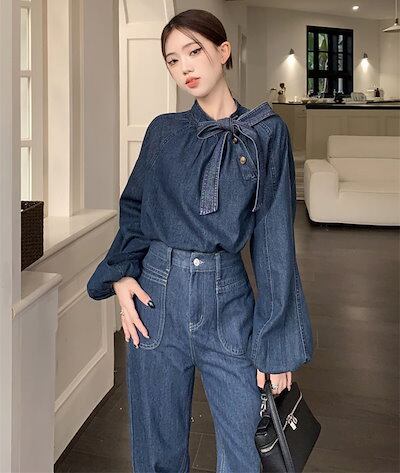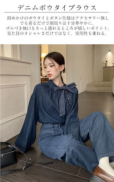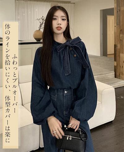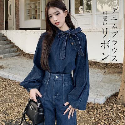 ボウタイブラウス レディース 長袖 プルオーバー ブラウス デニム ボウタイ トップス プチハイネック シャツブラウス バルーン袖 ボリュームスリーブ 斜めボタン 春 秋 カジュアル おしゃれ