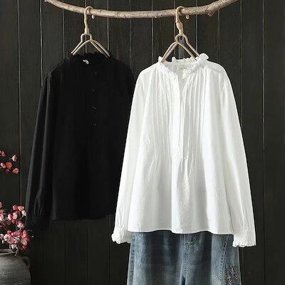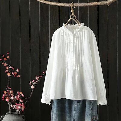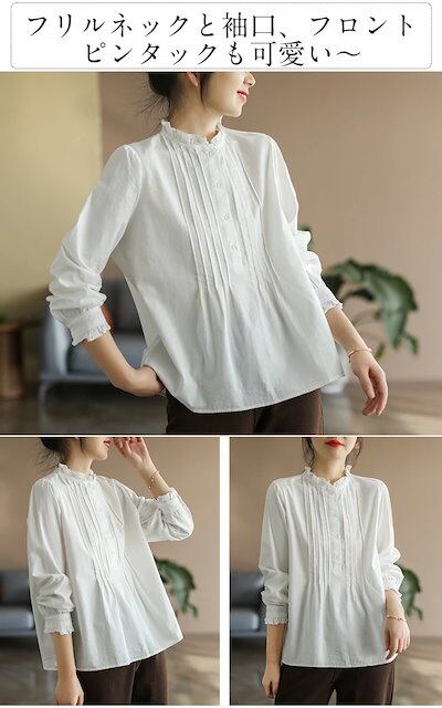 フリル ブラウス 長袖 レディース トップス シャツブラウス プルオーバー ブラウス ギャザー タック 白シャツ カジュアル 綿 コットン ボタン付き ワイシャツ 体型カバー ゆったり 大きいサイズ