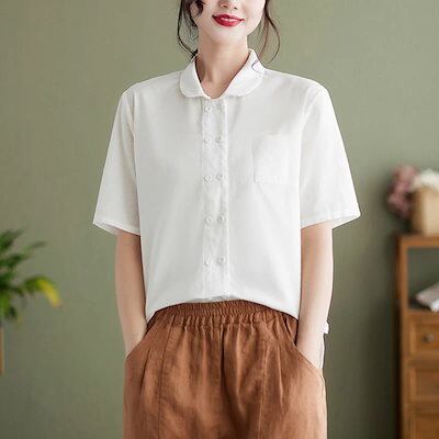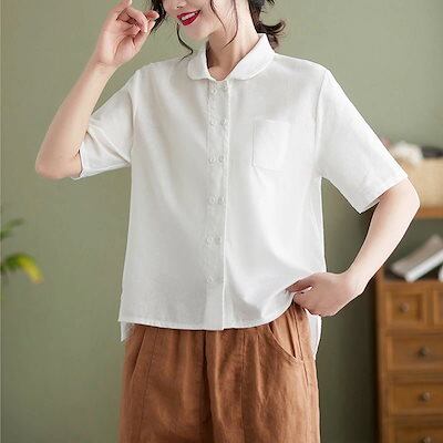 半袖シャツ レディース 襟付き シャツ ブラウス 半袖 シャツブラウス トップス 夏 半袖ブラウス 前後差 スリット 白シャツ ホワイトシャツ 綿混 無地 シャツ チビ襟 ダブルボタン 大きいサイズ