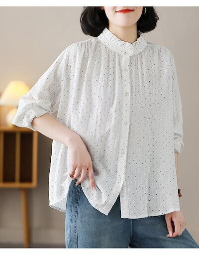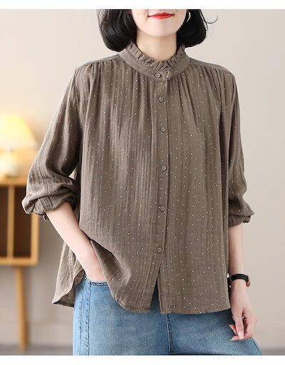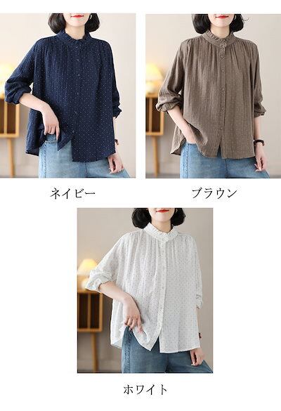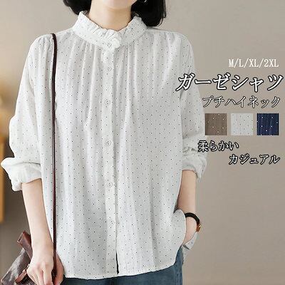 ブラウス レディース おしゃれ シャツ 長袖 立ち襟 シャツブラウス ドット柄 トップス ゆる 綿 コットンシャツ ふんわり 柔らかい 長袖シャツ バルーンスリーブ フリル 襟 水玉 前開き ボタン止