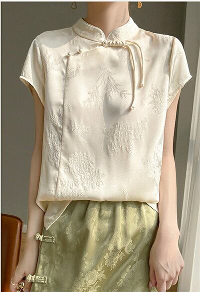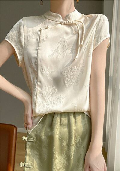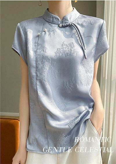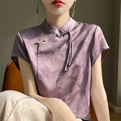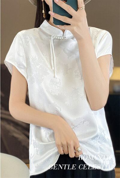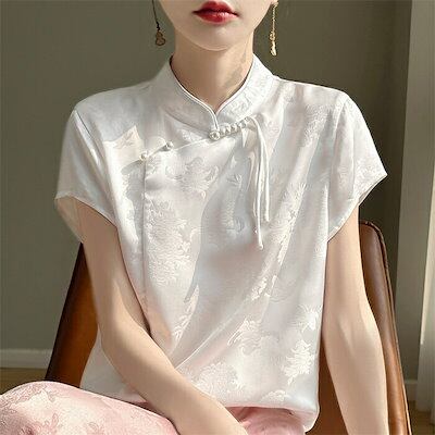 ブラウス チャイナ風 レディース 半袖 トップス 夏 薄手 立ち襟 チャイナトップス シルク風 花柄 刺繍 シャツ スタンドカラー プルオーバー チャイナボタン ゆったり エスニック 光沢 カジュアル