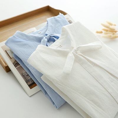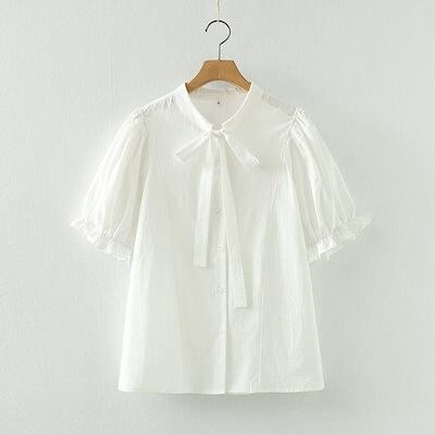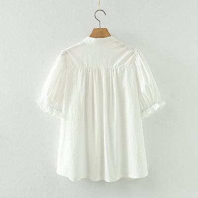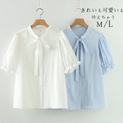 ブラウス 半袖 コットン 半袖シャツ レディース 夏 バンドカラー リボン ブラウス フリル袖 綿シャツ 白シャツ おしゃれ きれいめ ブラウス 細めリボン 仕事 オフィス シャツブラウス 無地 スト