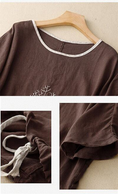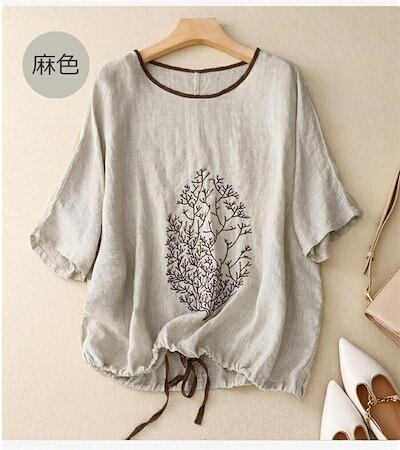 半袖シャツ tシャツ 刺繍 レディース グルーネック ブラウス トップス 刺繍シャツ シャツブラウス ショート丈 綿麻風 夏 半袖 無地 プルオーバー リボン付き シンプル お洒落 夏シャツ コーデ