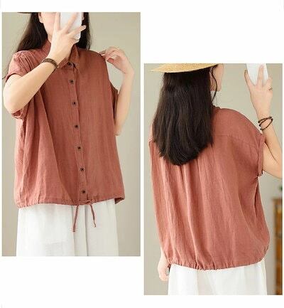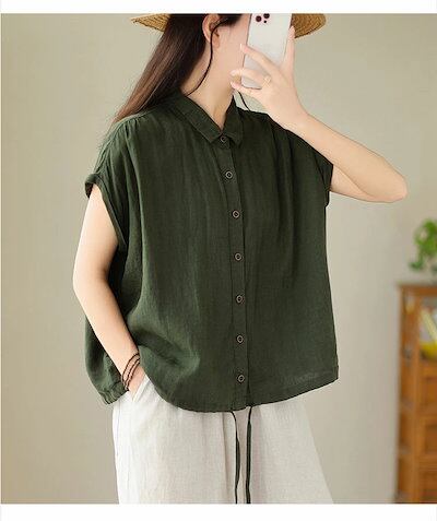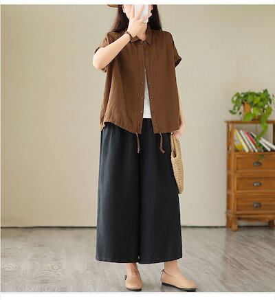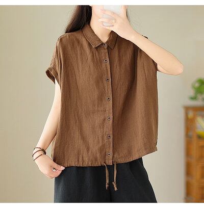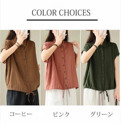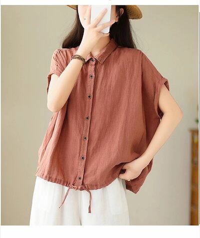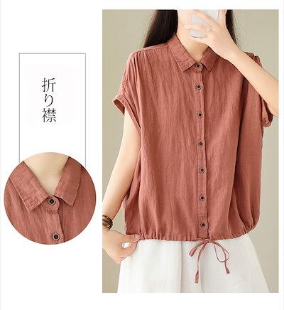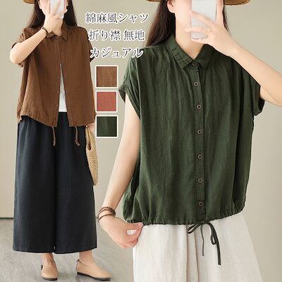 シャツ シャツブラウス レディース 綿麻風 ブラウス 折り襟 無地 リボン ボタン 前開き トップス フレンチスリーブ ギャザー 夏シャツ 大きいサイズ ゆったり 体型カバー リネンシャツ 涼しい 薄