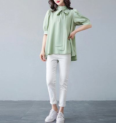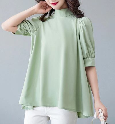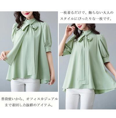 ブラウス パフスリーブ レディース シャツ 半袖 フォーマル リボン シャツブラウス フレア Aライン ボウタイ ぽわん袖 チュニック 後ろリボン ハイネック ボリューム袖 トップス 大きいサイズ 体