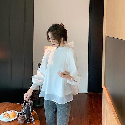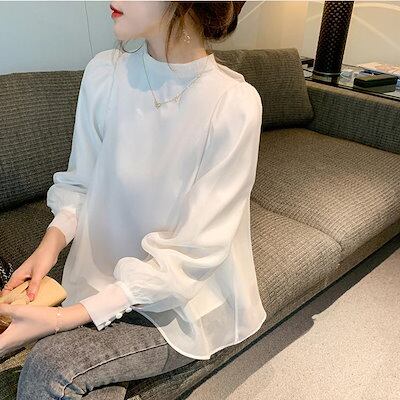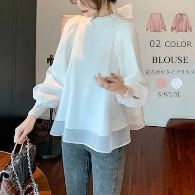 春新作 ブラウス レディース ボウタイブラウス ボウタイ リボンブラウス ボリューム袖 袖ギャザー ふんわり袖 長袖 大人 無地 個性的 体型カバー 春夏新作 おしゃれ パフスリーブ シフォンブラウス