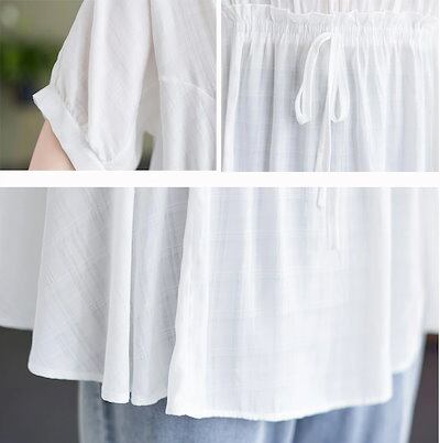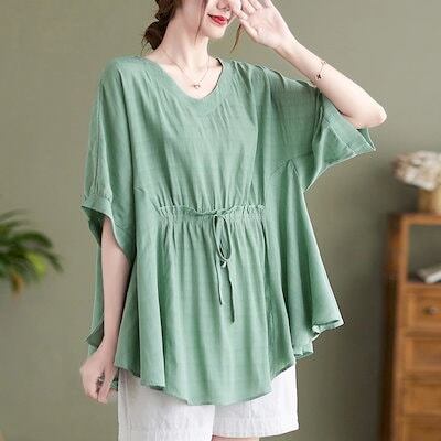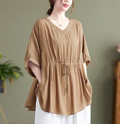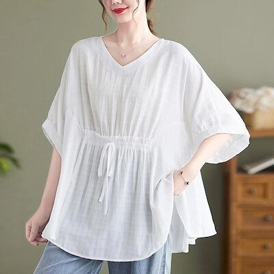 半袖ブラウス レディース 夏 綿 麻 ブラウス チュニック 半袖 タック ギャザー フリル トップス Vネック リボン プルオーバー Tシャツ コットン リネン カットソー フレア 無地 体型カバー