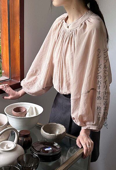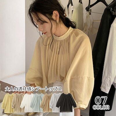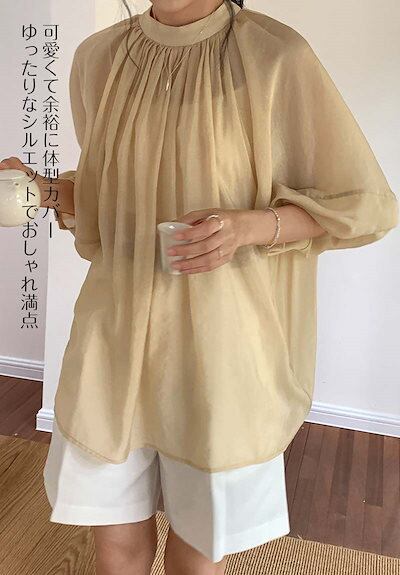 シアートップス レディース 綿混 ギャザー バルーン袖 ブラウス シアー リボン レイヤード 透け感 長袖 着回し トップス 体型カバー 丸首 シースルー ルーズフィット 薄手 プルオーバー ミドル丈