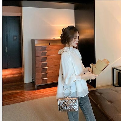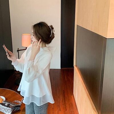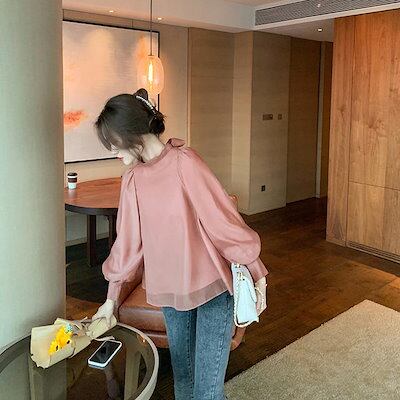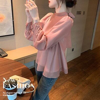 ブラウス レディース ボウタイブラウス ボウタイ リボンブラウス ボリューム袖 袖ギャザー ふんわり袖 長袖 大人 無地 個性的 体型カバー 春夏新作 おしゃれ パフスリーブ シフォンブラウス トップ