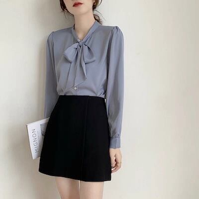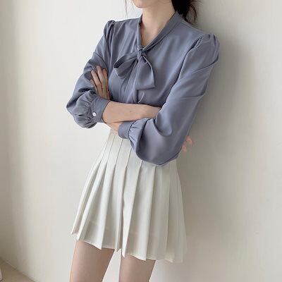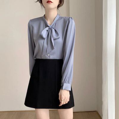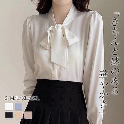 ブラウス ボウタイ レディース 長袖 シャツ フォーマル スーツ インナー サテンシフォン ブラウス シャツ ボウタイブラウス トップス Vネック とろみシャツ プルオーバー リボン付き シルクタッチ