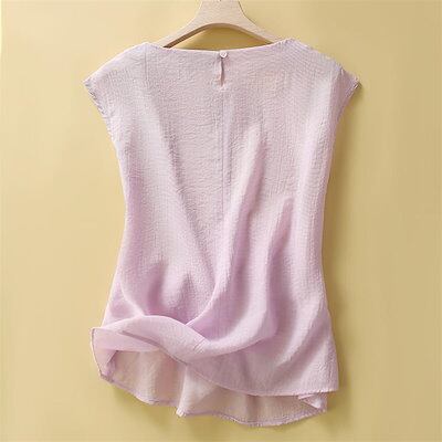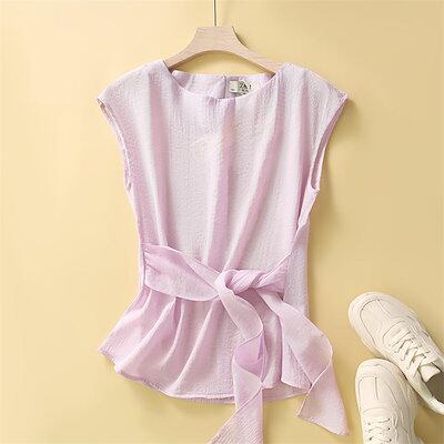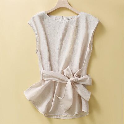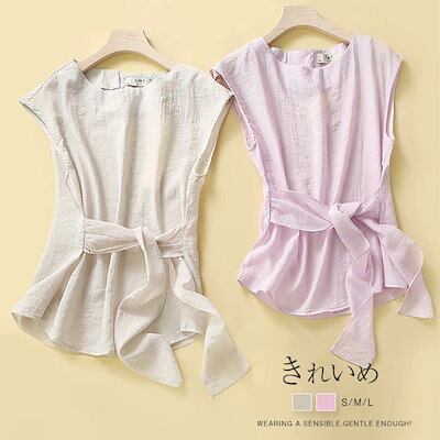 ノースリーブ ブラウス レディース 夏 フォーマル スーツ インナー 夏ブラウス トップス クルーネック 薄手 涼しい 無地 ゆったり フェミニン 光沢感 リボン ベルト付き エレガント 着心地 上品