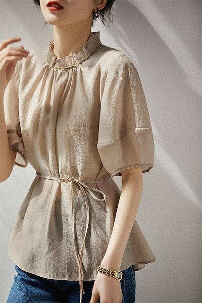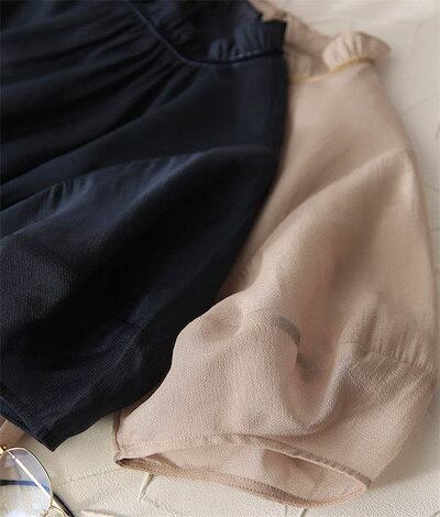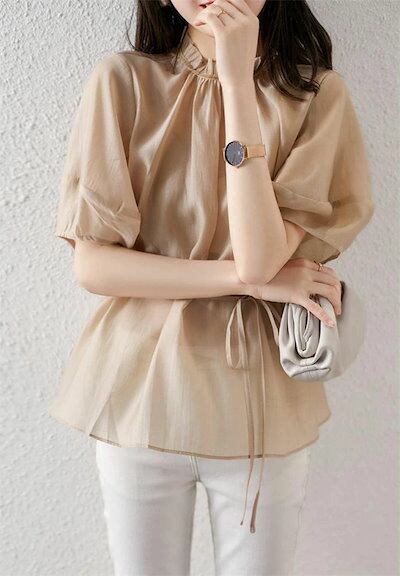 シースルー ブラウス 夏 レディース パフスリーブ ボリューム袖 シアー シースルーブラウス ギャザー ブラウス 半袖 無地 リボン付き フリルネック プルオーバー 大人 フェミニン ゆったり ゆる