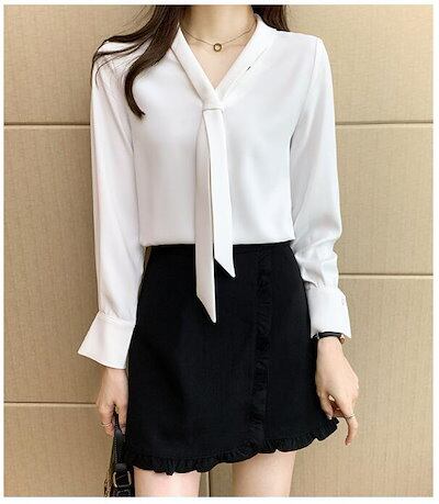 シャツ ブラウス レディース 長袖 トップス シフォン スカーフタイプ ブラウス スーツインナー ボウタイ ブラウス スカーフカラー Vネック プルオーバー 無地 リボン 夏 春 秋 シンプル フォー