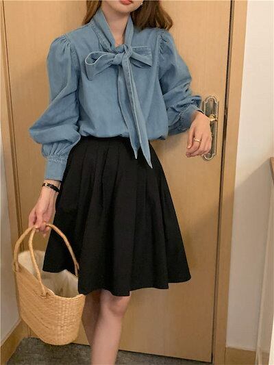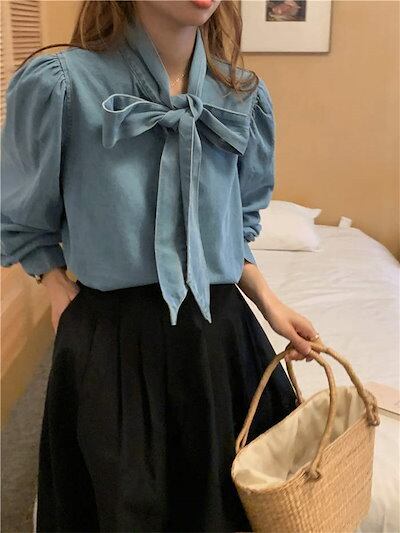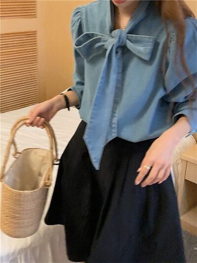 ボウタイブラウス デニム シャツ レディース チュニック 長袖 トップス 春 秋 無地 ボウタイ デニムトップス プルオーバー リボン デザインブラウス ゆったり カジュアル エレガント おしゃれ 着