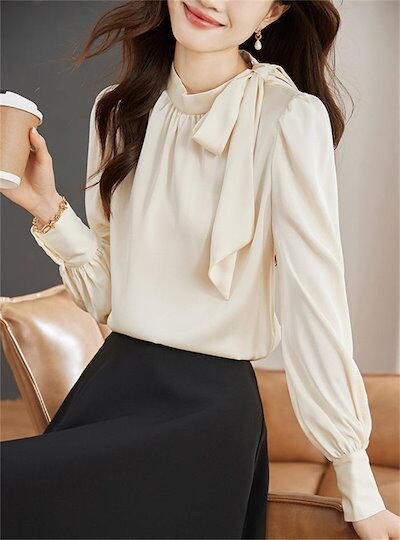 ボウタイ ブラウス きれいめ 長袖 レディース 春秋 キレイめ トップス シャツブラウス フォーマル オフィス リボン 結びリボン 結び襟 リボンタイ サテン ブラウス 着まわし ボウタイリボン シン