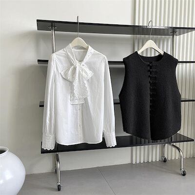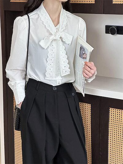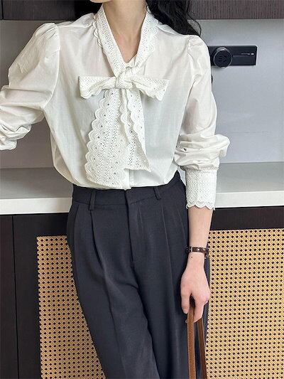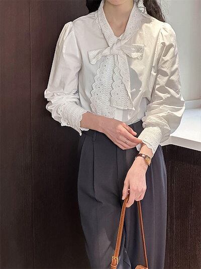 レース ボウタイブラウス レディース スーツブラウス 長袖 レディースブラウス 無地 シャツブラウス コットン 綿混 七五三 ママ スーツインナー 入学式 卒業式 インナー ボウタイ リボンタイ 袖口