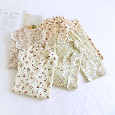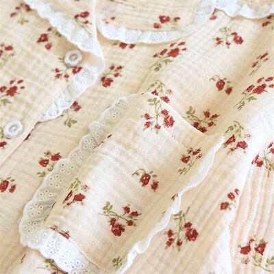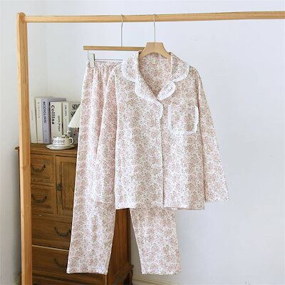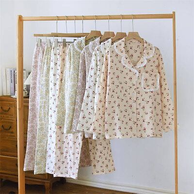 ガーゼ パジャマ レディース ルームウェア パンツ 春 秋 ガーゼコットン vネック 総柄 花柄 フリル 配色 春秋 長袖 ダブルガーゼ 2重ガーゼ 綿 部屋着 セットアップ 2点セット ナイト 寝間