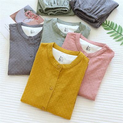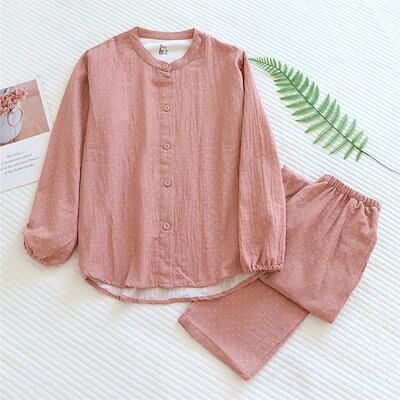 ガーゼ パジャマ レディース ダブルガーゼ ドット 総柄 ルームウェア 春 秋 冬 長袖 ロングパンツ 部屋着 セットアップ 2点セット 寝間着 寝巻き 上下セット 前開き 大きいサイズ 大人 フェミ
