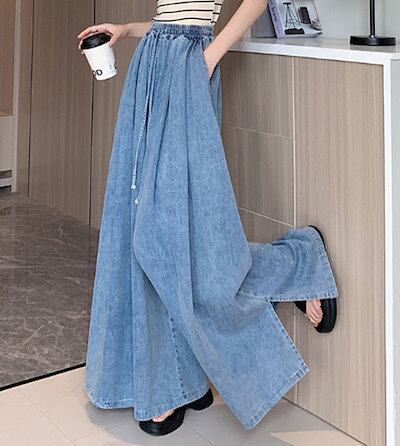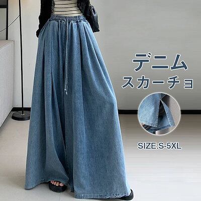 ジーンズ デニムスカーチョ レディース ワイドパンツ スリット ゴムウエスト デニム デニムパンツ きれいめ 股上深め 大きいサイズ 春夏秋 フレアパンツ ゆったり おしゃれ 無地 体型カバー 着痩