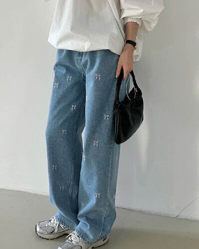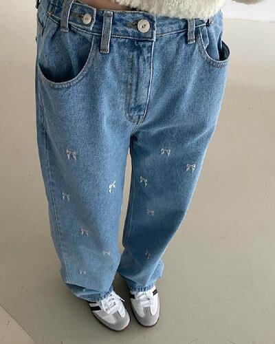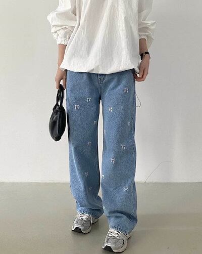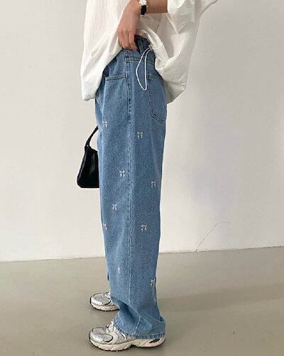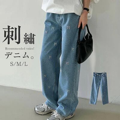 ワイドパンツ デニム リボン刺?付き レディース 春 秋 ガウチョパンツ 花柄 リボン刺? デニムパンツ 体型カバー ハイウェスト 大きいサイズ おしゃれ ゆったり カジュアル ナチュラル カジュア