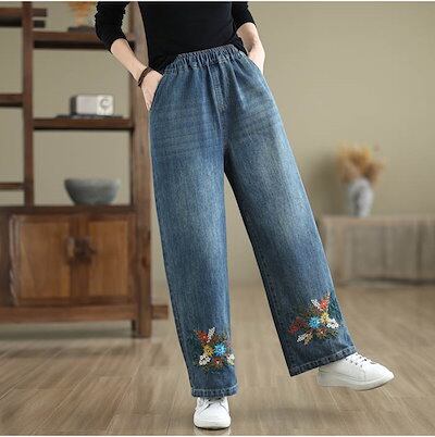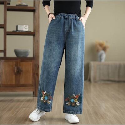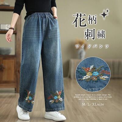 ワイドパンツ デニム レディース 花柄 刺? 春 秋 ロング丈 デニム パンツ 華奢見え 体型カバー おしゃれ ゆったり カジュアル ナチュラルカジュアル 着痩せ ボトムス ゆるっと 大きいサイズ