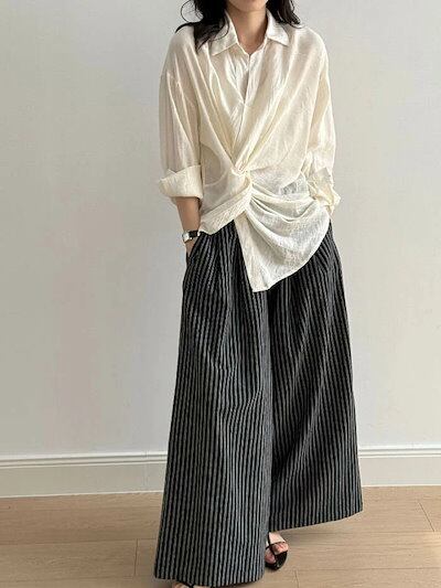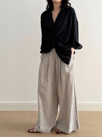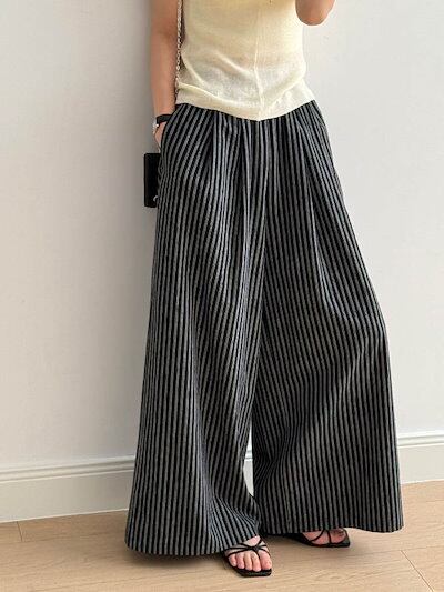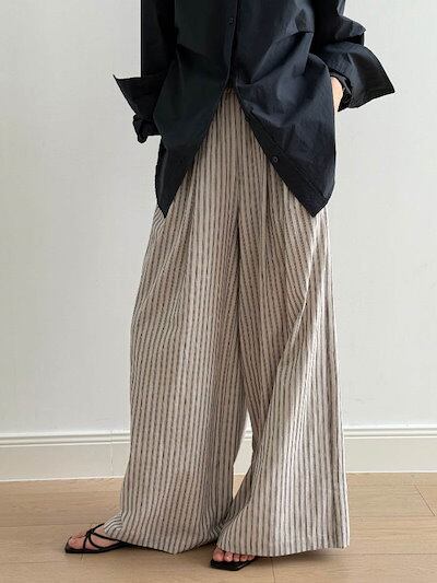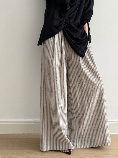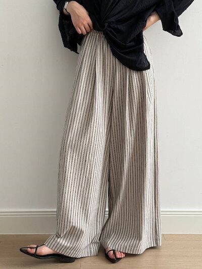 ストライプ パンツ レディース 春 夏 秋 ワイドパンツ 綿麻混 ボトムス 綿麻パンツ パンツ ワイド スラックス ワイドパンツ ストライプ柄 美シルエット ハイウエスト 落ち感 シンプル カジュアル