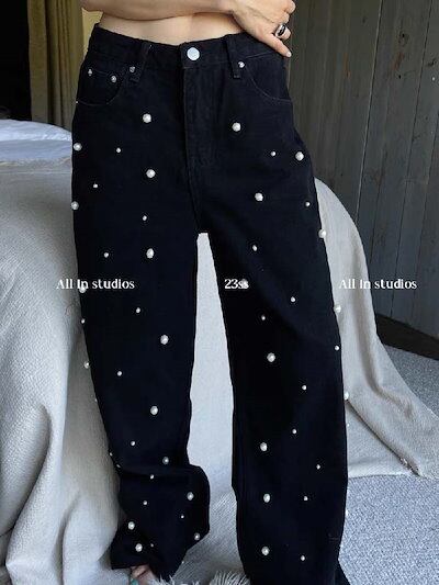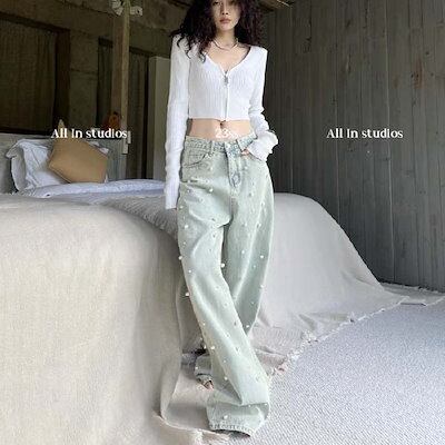 ワイドパンツ デニム レディース 春 秋 パール付き ガウチョパンツ ワイドデニム デニムパンツ 体型カバー ジーンズ ハイウェスト デニム ロングパンツ 大きいサイズ ロング丈 華奢見え おしゃれ