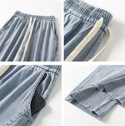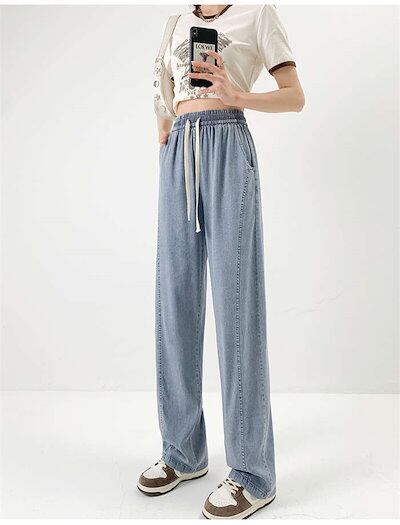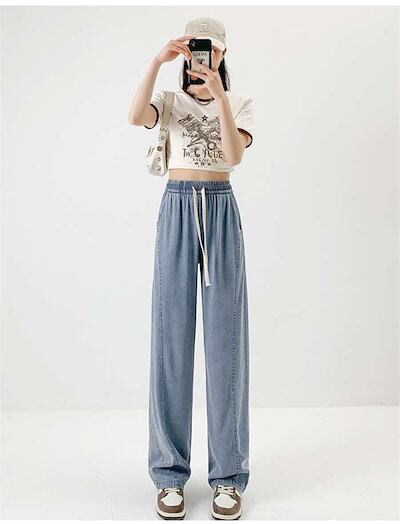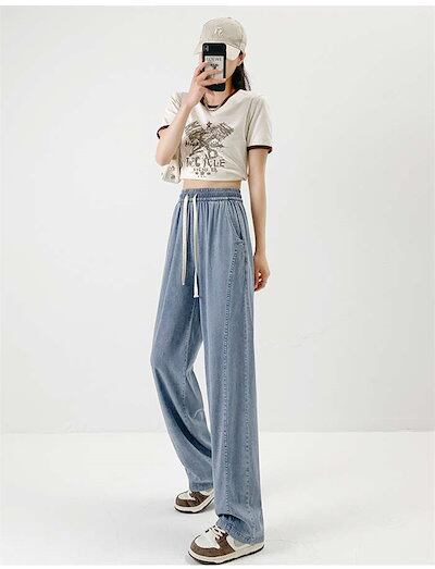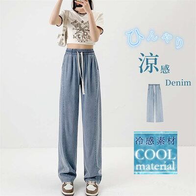 2024新作 デニムパンツ レディース パンツ 夏 冷感 ワイドパンツ ワイド デニム ストレッチ ストレート ボトムス 吸汗 速乾 通気 UVカット 涼しい ウエストゴム ハイウエスト ポケット ゆ