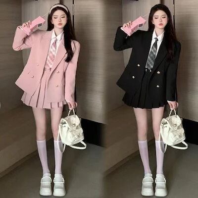 韓国ファッションッセットアップ レディース 4点セット 長袖 制服 ジャケット シャツ スカート リボン 女子 スーツ 小学校 卒服 卒業式 韓国ファッション 女の子 お受験 プリーツスカート きれい