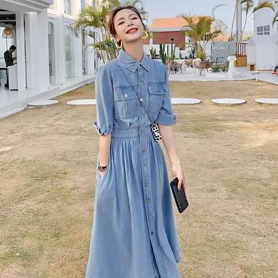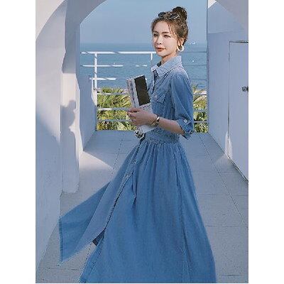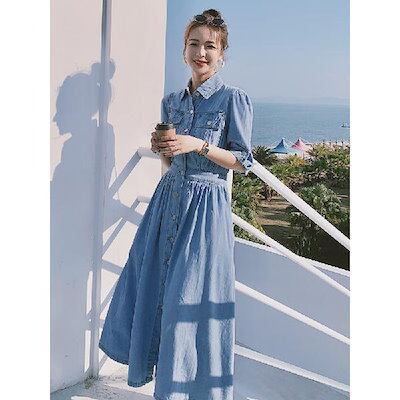 2023 ニューデザインデニム ワンピース レディース 夏 薄い バブル袖 優しい シャツ ヘアアクセサリー レトロ ロングスカート