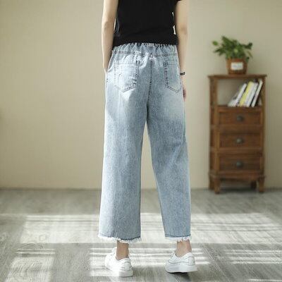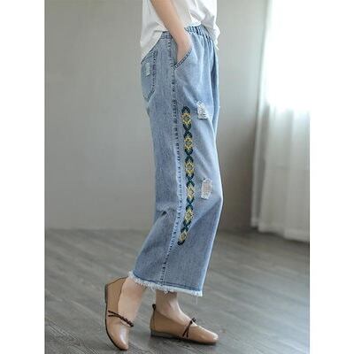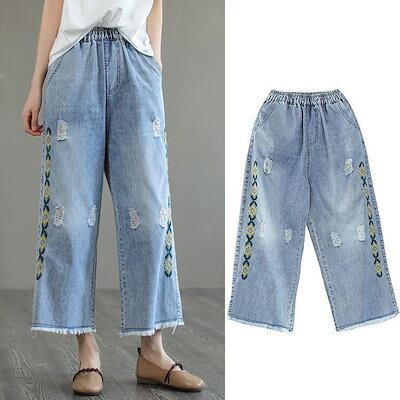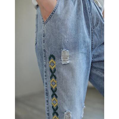 【GUANGYU】ジーンズ バギーパンツ ワイドパンツ 春 夏 秋 ダメージ ウォッシュ アンクル丈 刺繍 デニムパンツ レディース