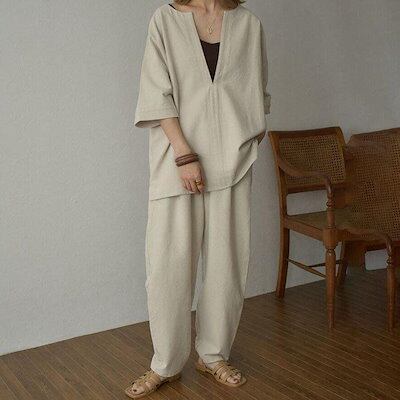 【Primepic】【急速出荷】セットアップ レディース 40代 春夏新作 五分袖TシャツVネック ロング丈パンツ 上下セット ゆったり オシャレ 韓国風セットアップ 着痩せ カジュアル 30代