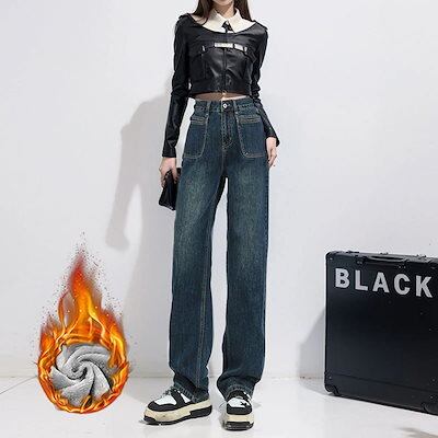即?ブルーグレー デニムボトムス レディース 厚手 ゆったり あたたまること 裏起毛 ワイドパンツ ジョガーパンツ ポケット デザイン感 ハイウェスト ストレートパンツ モップパンツ ジョガーパンツ